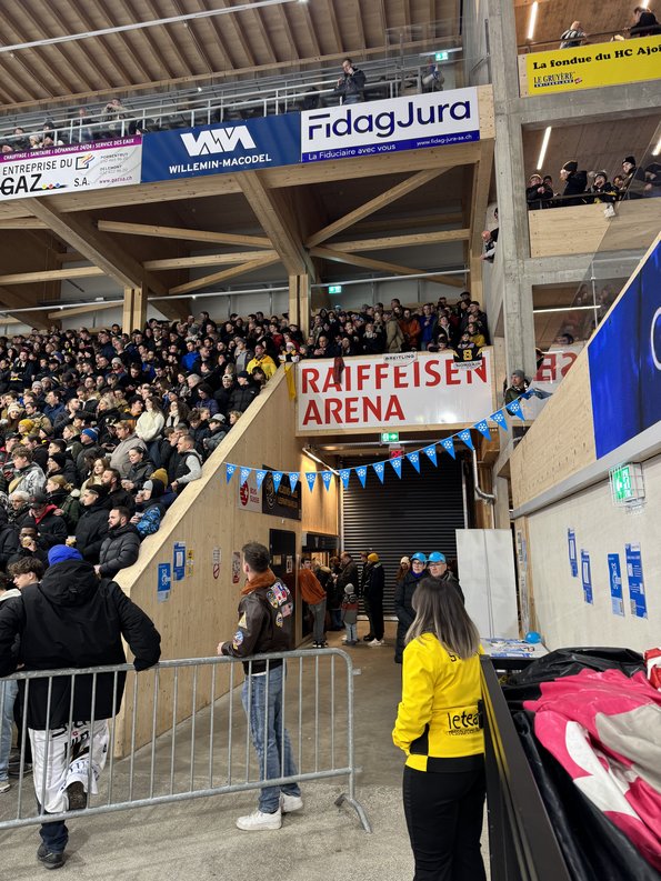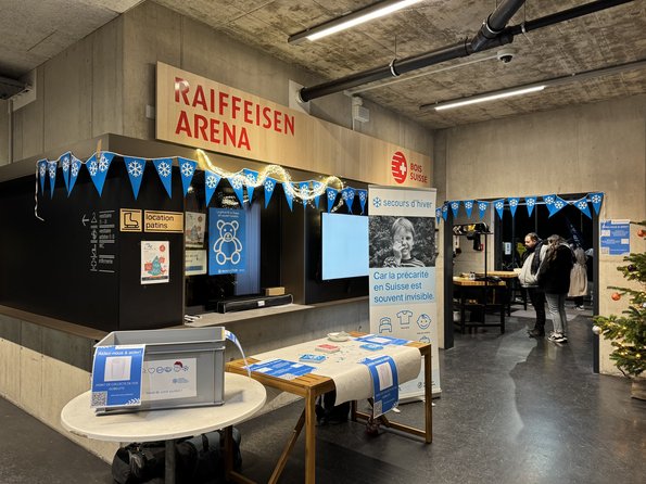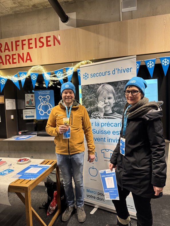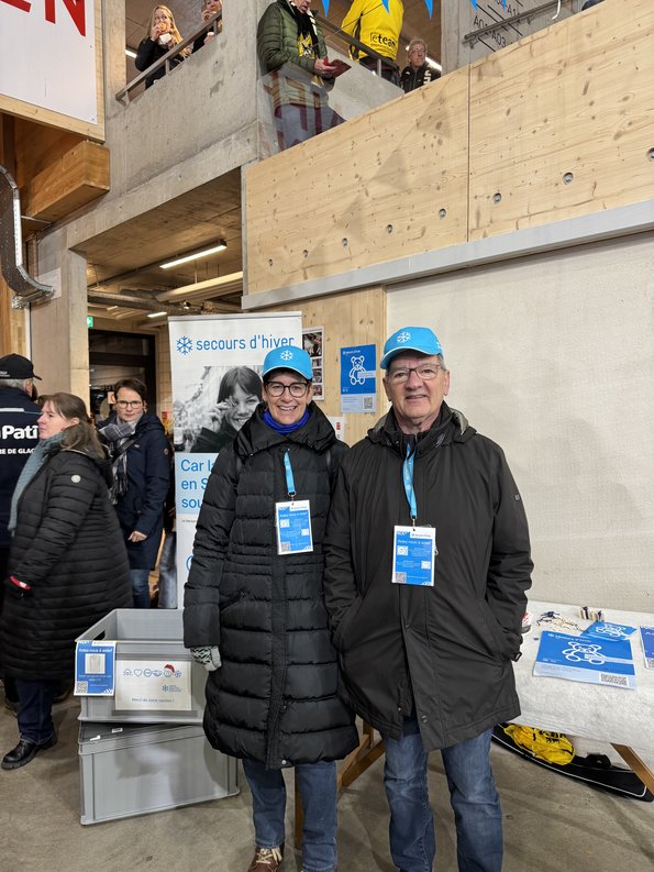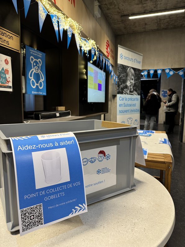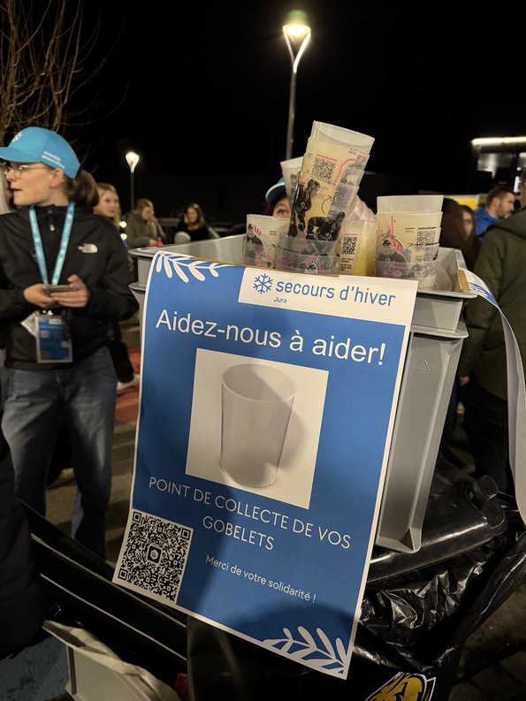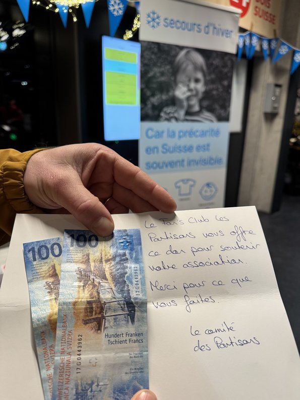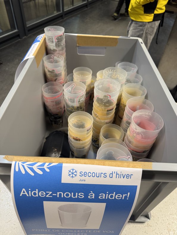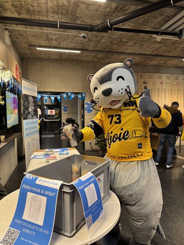 - Eine Sammlung von Pfandbechern wurde in einer wohlwollenden und herzlichen Atmosphäre organisiert. Die Zuschauer waren eingeladen, ihre Becher gegen ein Pfand von 2 Franken zugunsten der Winterhilfe Jura abzugeben. Ziel war es, mit einer voll besetzten Eisbahn einen namhaften Betrag zur Finanzierung unserer Solidaritätsprojekte zu sammeln.