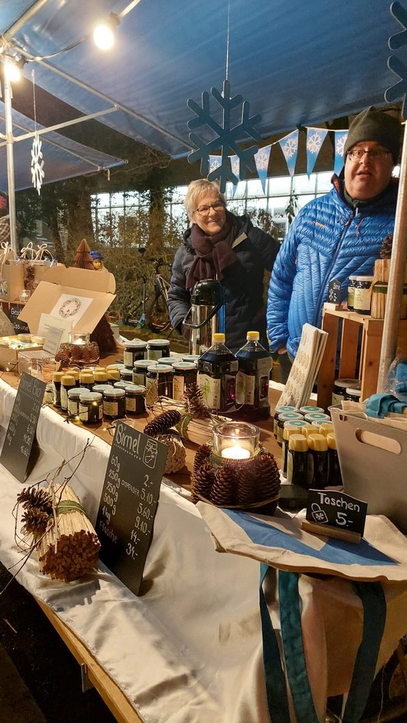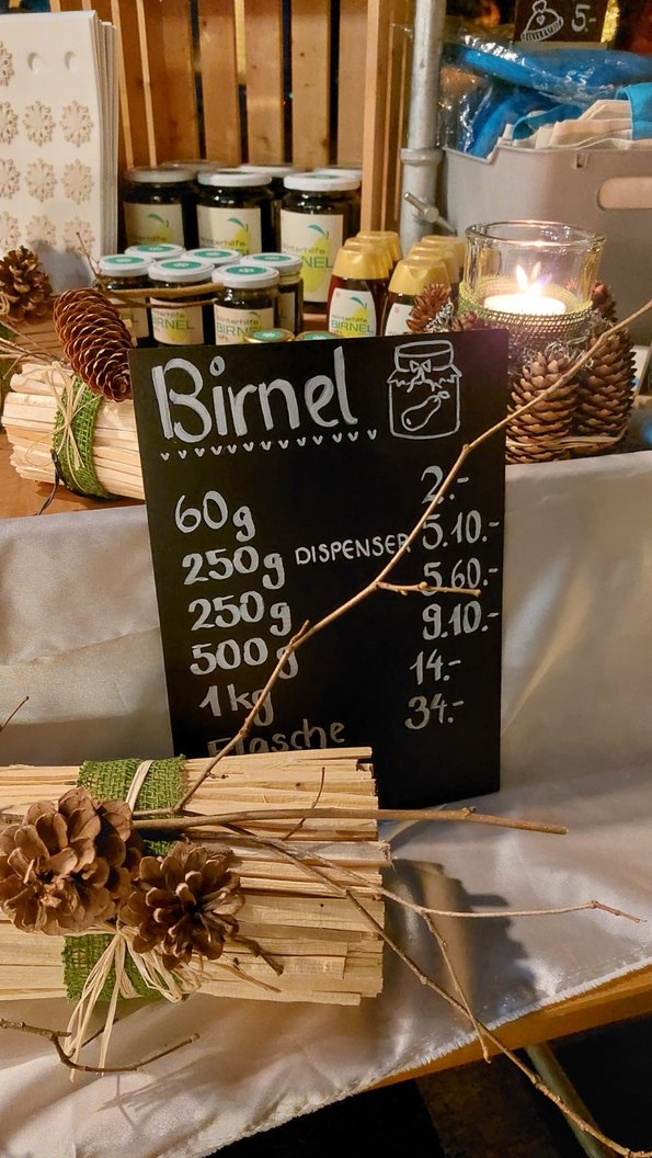Mittendrin: Der festlich geschmückte Stand der Winterhilfe Glarus. Die Geschäftsstellenleiterin Nadja Stalder und die Mitglieder des Vorstandes genossen den Austausch mit den allen, die Winterhilfe-BIRNEL kaufen und mehr über die Arbeit der Winterhilfe Glarus erfahren wollten.
