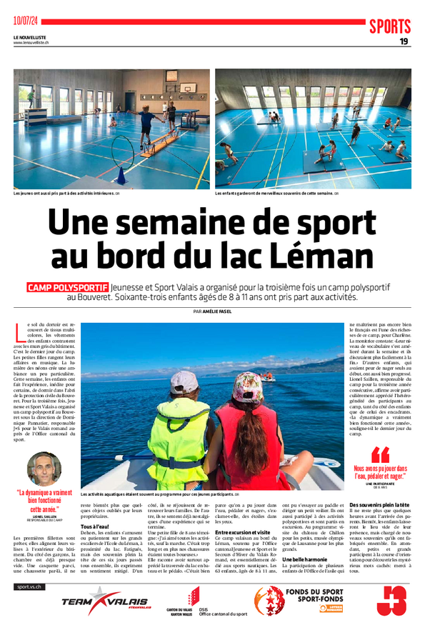 Dieses Walliser Lager am Genfersee, das vom kantonalen Amt für Jugend und Sport und der Winterhilfe des französischsprachigen Wallis unterstützt wird, ist hauptsächlich dem Wassersport gewidmet. Die dreiundsechzig Kinder im Alter von 8 bis 11 Jahren konnten sich im Paddeln versuchen und ein kleines Segelboot steuern. Sie nahmen auch an polysportiven Aktivitäten teil und unternahmen Ausflüge. Auf dem Programm standen ein Besuch des Schlosses Chillon für die Kleinen und das Olympische Museum in Lausanne für die Größeren.