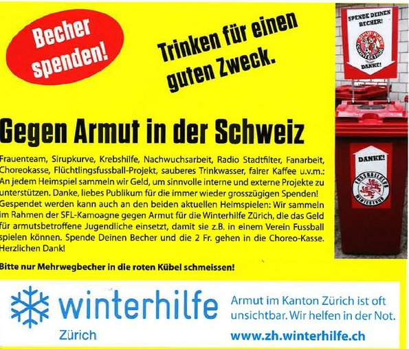 Über 100'000 Kinder in der Schweiz spüren die Folgen der Armut ihrer Eltern direkt und müssen auf vieles verzichten: Zum Beispiel auf das Fussballspielen im Verein. Deshalb setzten sich vom 2. bis 10. November 15 Klubs aus der Raiffeisen Super League und der Brack.ch Challenge League mit Unterstützung der Ligasponsoren und gemeinsam mit der Winterhilfe dafür ein, die unsichtbare Armut in der Schweiz sichtbarer zu machen und «Fussball für alle» zu ermöglichen. Medienmitteilung und Fact Sheet zur Themenwoche (SFL)