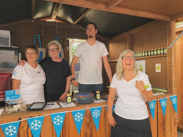 Unser Stand ist bereit: v.l.n.r. Sylvia Dennenmoser (TG), Monika Stampfli (CH), Nadja Stalder (GL), Yuchi Wang (AG) und Fabian Dreher (CH).